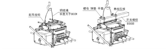 開關(guān)在搬運(yùn)、安裝時(shí),嚴(yán)禁搬抬電纜進(jìn)出線套管、開關(guān)操作手柄和操作機(jī)構(gòu)外殼。運(yùn)輸時(shí)必須整臺(tái)裝入封閉的包裝箱內(nèi)加以固定。運(yùn)輸過程中不得翻轉(zhuǎn)、傾斜,需采取防震措施。起吊負(fù)荷開關(guān)時(shí),必須勾住箱體上的吊裝裝置。