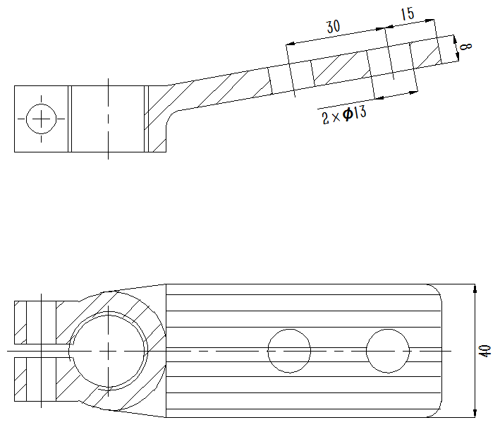 進(jìn)出線端子截面尺寸為40mm×8mm,材質(zhì)為T2銅及以上,電導(dǎo)率≥56 S/m;外表面鍍錫處理,鍍層厚度≥12μm;安裝螺孔為2- ϕ13mm,孔間距為30mm,距離端面15mm,見圖3-9所示。