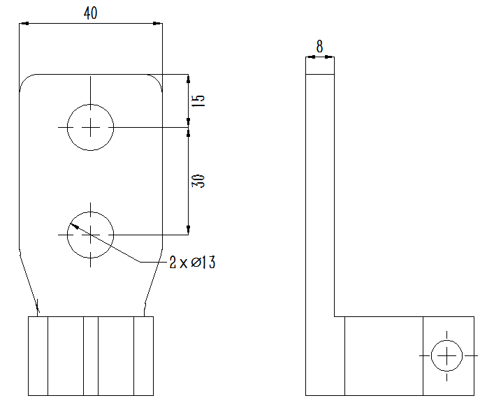 進出線端子截面尺寸為40mm×8mm,材質為T2銅及以上,電導率≥56 S/m;外表面鍍錫處理,鍍層厚度≥12μm;安裝螺孔為2- ϕ13mm,孔間距為30mm,距離端面15mm,見圖3-9所示。