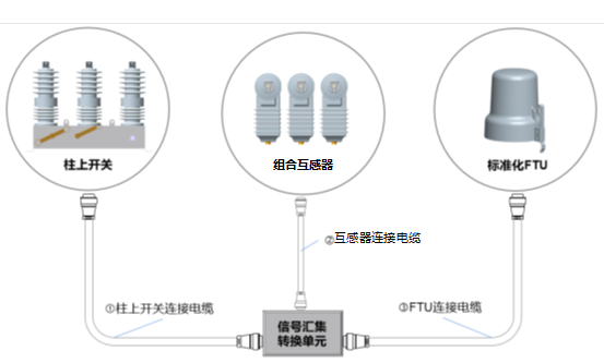 信號匯集轉換單元與柱上開關、電壓電流互感器、FTU通過航空電纜進行連接,連接方式如圖4-54所示,電纜要求如表4-72所示?;ジ衅鬟B接電纜長度不超過1.2米,安裝時必須固定于柱上開關支架上,避免在任何情況下觸碰到高壓帶電導體。